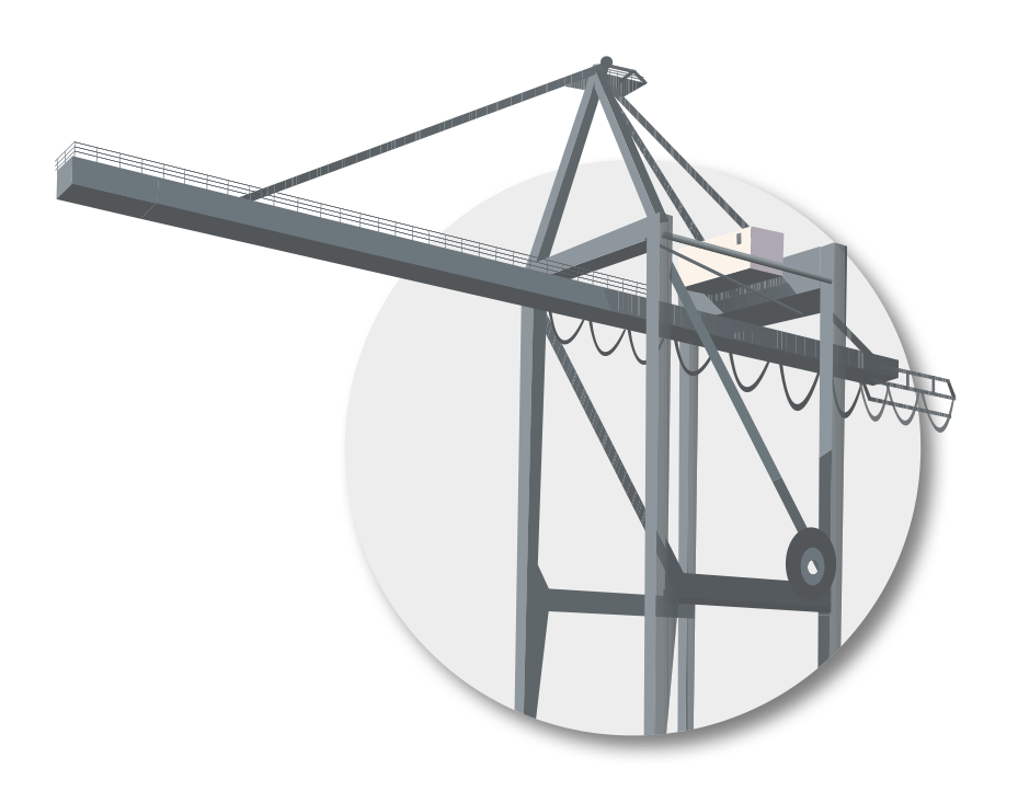 | When container cranes are not in operation, the water-side boom is raised and brought into a vertical rest position. The reasons for this are, for example, to increase traffic safety (collision avoidance with approaching or departing ships) or to protect against the weather. | When the crane is prepared for operation, the boom is lowered. The load torque increases the closer the boom gets to the horizontal working position. The maximum braking force of the boom brakes is selected so that the boom can also be stopped and held close to the horizontal working position. |